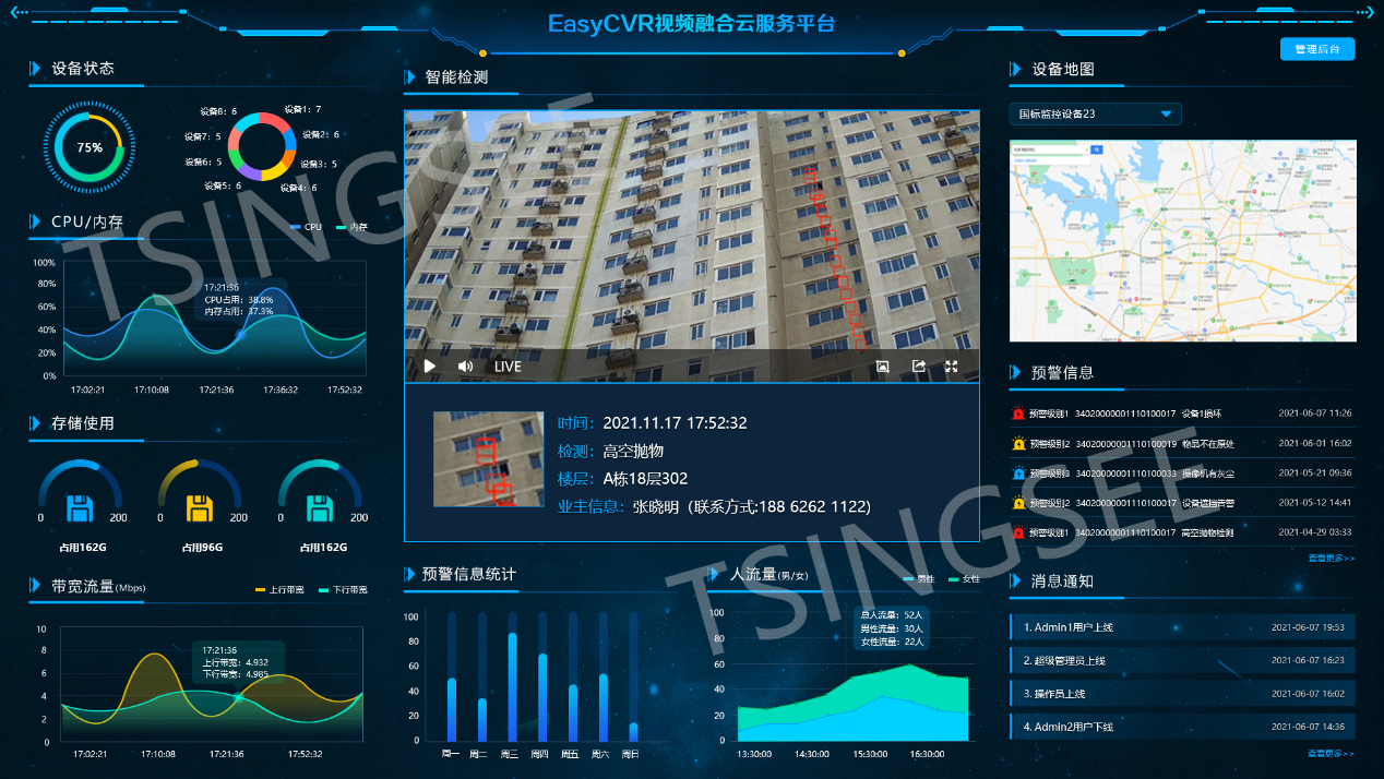 平台界面顯示設備接入狀态、運行、寬帶、存儲空間等狀态監控,直觀顯示人、車(chē)、物(wù)、監控高空抛物(wù)等智能識别違規行為和結果。設備監控圖片。報警信息報告。GPS設備定位等信息,全面掌握建築。住宅及周邊地區的實時安全狀況。